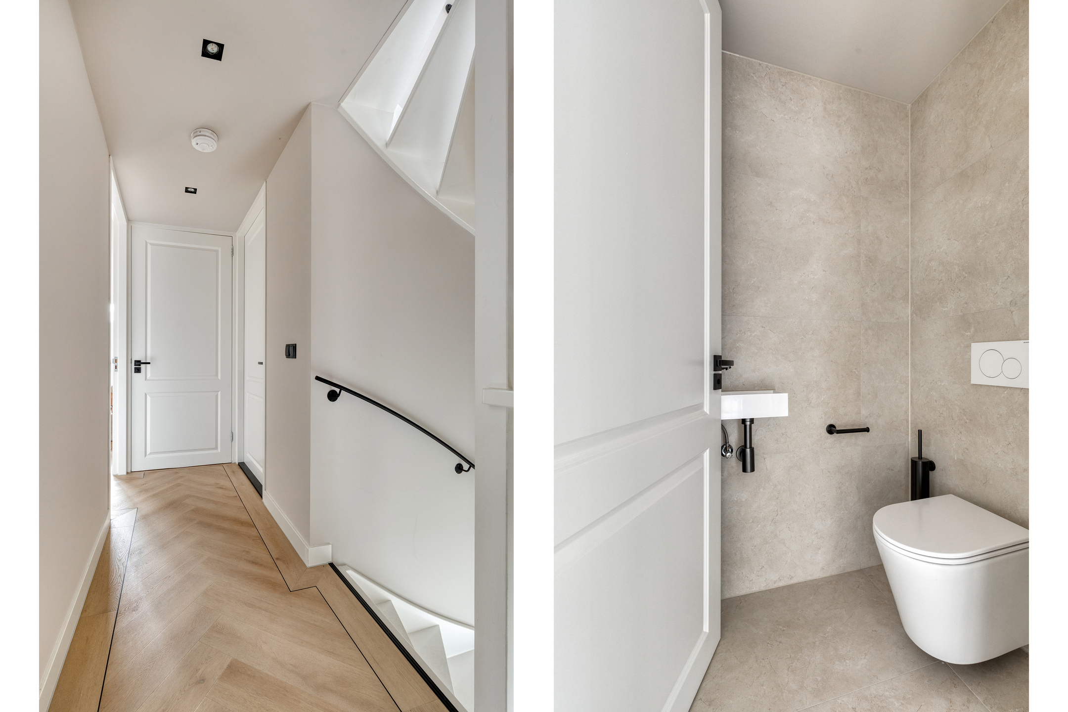 Through the front garden, you reach the neat entrance with a meter cupboard and modern toilet. The bright through-living room features large windows at the front and a sliding door plus an additional door to the backyard at the rear. The modern open kitchen in a U-shaped layout is located at the front and is partially separated by a half-height wall. The kitchen is luxuriously equipped with white cabinets, a natural stone countertop, induction hob, extractor hood, built-in combi oven/microwave at eye level, dishwasher, Quooker tap, and recessed spotlights.