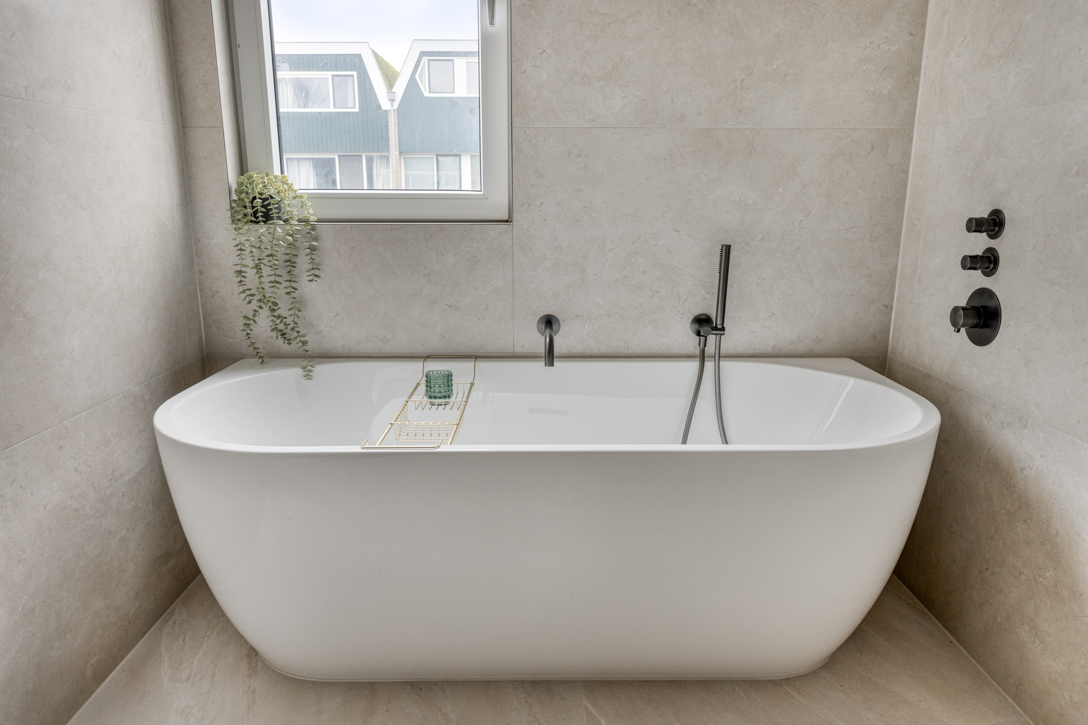 Hier bevinden zich twee ruime slaapkamers, een vaste bergkast en een royale, moderne badkamer. De verdieping (m.u.v. de badkamer) is voorzien van een stijlvolle pvc-visgraatvloer. De luxe badkamer is geheel betegeld en beschikt over een ligbad met inloopdouche, dubbele wastafel met meubel, designradiator, elektrische vloerverwarming en ramen voor daglicht en natuurlijke ventilatie.