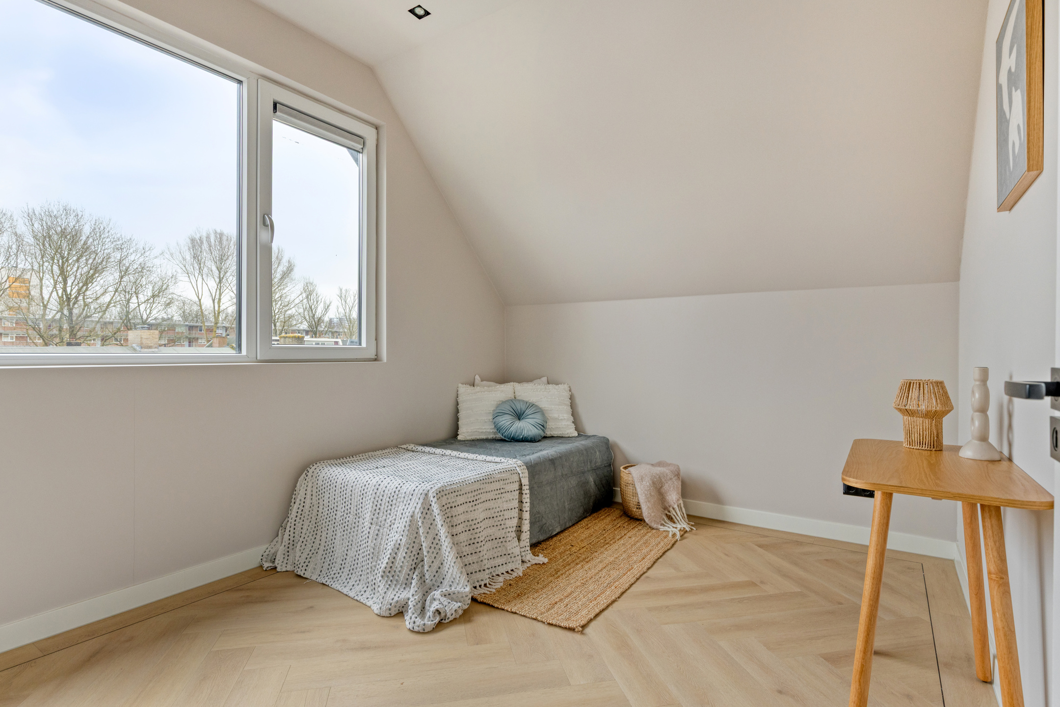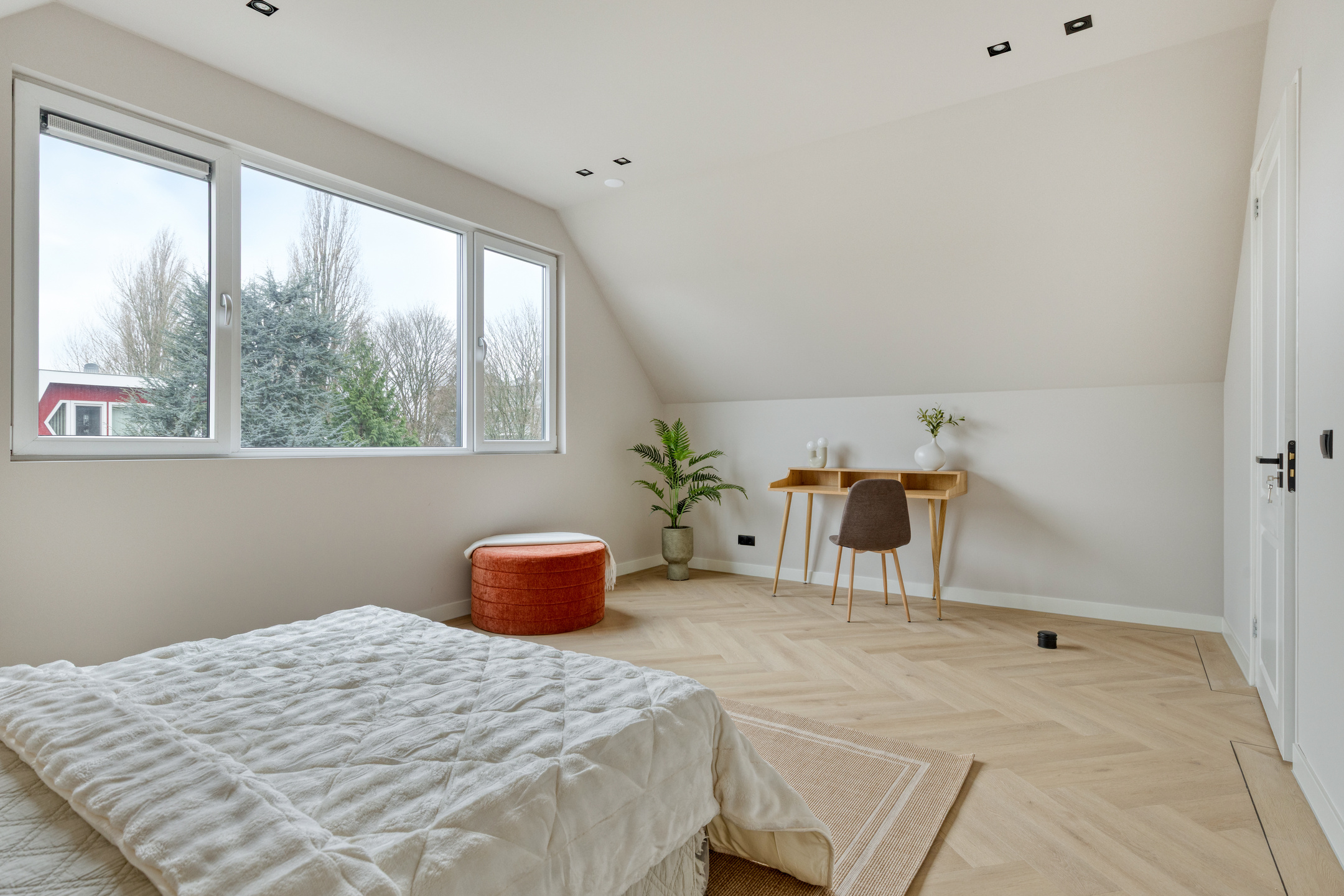 Op de tweede verdieping vind je nog twee slaapkamers, beide met grote ramen en dezelfde fraaie pvc-visgraatvloer. Ook is er een tweede moderne badkamer, voorzien van inloopdouche, wastafel, hangend toilet, elektrische vloerverwarming en ramen. Een comfortabele en praktische verdieping voor een groot gezin, logees of een fijne werkplek aan huis.