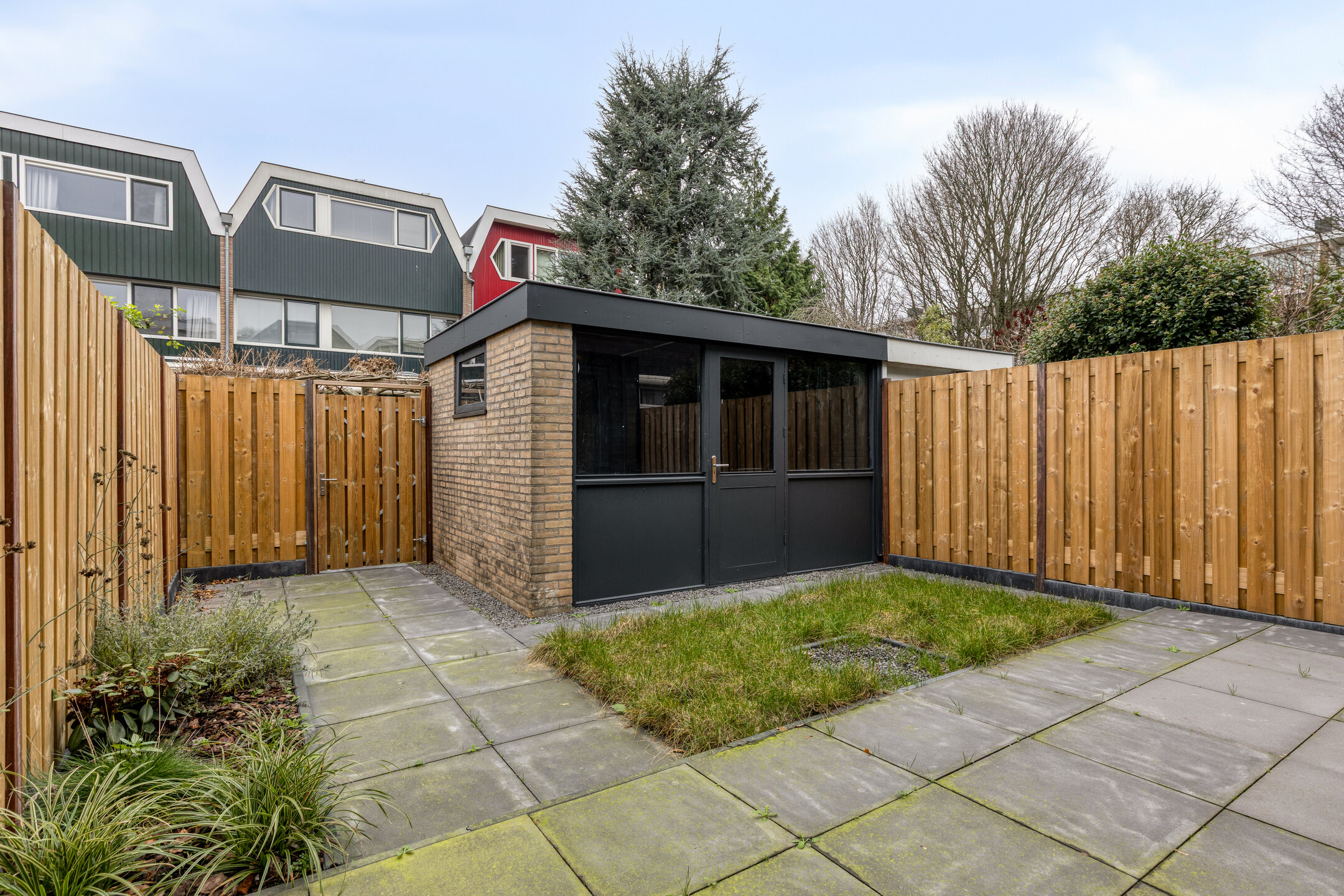 De diepe achtertuin ligt ideaal, waardoor je de hele dag kunt genieten van de zon. Achterin vind je een vrijstaande stenen berging met elektra en een handige achterom. De tuin is onderhoudsvriendelijk aangelegd met bestrating en groene borders.