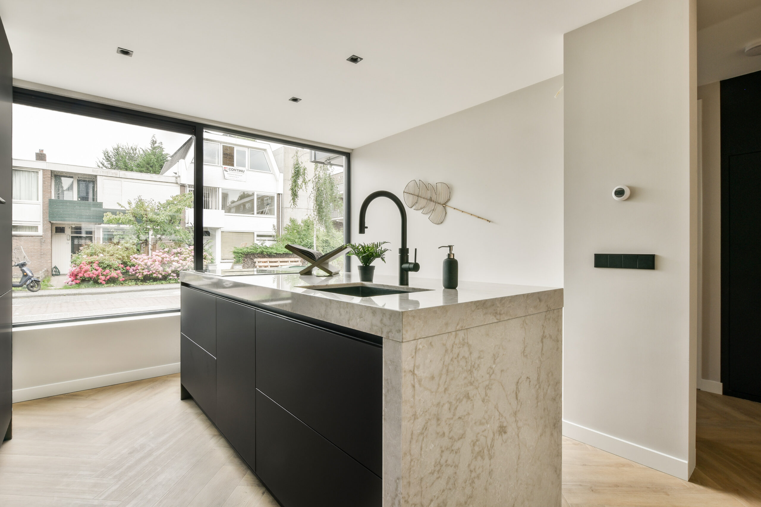 Aan de voorzijde bevindt zich de luxe open keuken, een waar paradijs voor kookliefhebbers. Uitgevoerd met elegante zwarte kasten, een natuurstenen werkblad en topkwaliteit inbouwapparatuur, waaronder een inductiekookplaat, afzuigkap, twee combi-ovens, een koelkast, vaatwasser en een Quooker. Het kookeiland en de strakke inbouwspots maken het geheel af.