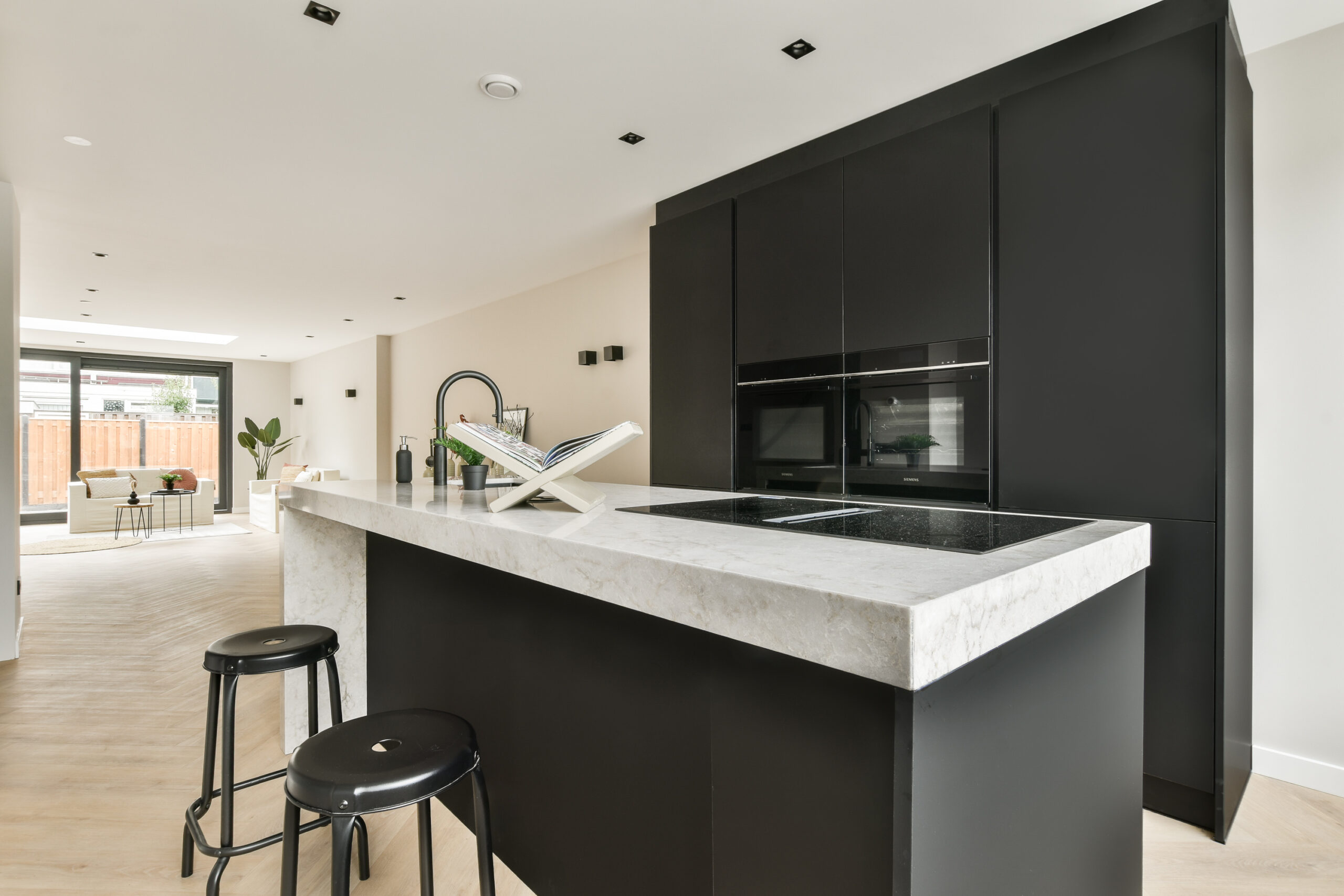 • Hoogwaardige inbouwapparatuur: inductiekookplaat, afzuigkap, twee combi-ovens, koelkast, vaatwasser en Quooker